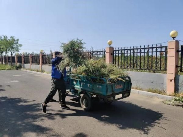 圖為愛邇職工將拔除蒿草進(jìn)行清運(yùn)