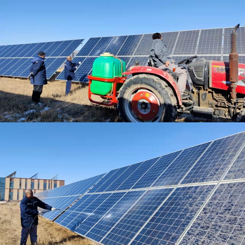 光伏電站在運(yùn)行過程中,因自然環(huán)境及周圍環(huán)境對(duì)光伏組件表面造成污染,使得透光率降低,是導(dǎo)致系統(tǒng)發(fā)電效率降低的重要原因之一。外加今年冬季降雪少,灰塵堆積嚴(yán)重,發(fā)電效率明顯下降。針對(duì)以上情況,澤霖公司根據(jù)冬季實(shí)際情況認(rèn)真部署、周密策劃,在明確各項(xiàng)清洗作業(yè)要求及安全注意事項(xiàng)前提下,分時(shí)段、分區(qū)域、分小組對(duì)廠區(qū)各方陣開展清洗工作。