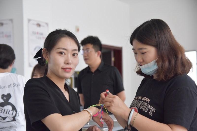 彩繩編織心靈巧。經(jīng)過壓、挑、穿、拉等步驟,五彩繩在手指的靈活捻動下,誕生了一個個漂亮的金剛結(jié)、雙聯(lián)結(jié)、鎖結(jié)等,絲絲彩繩寓意著祈福納吉、期盼美好,也傳遞著濃濃端午情。大家一邊編織五彩繩,一邊互相交流著誰編織的樣式更新穎。
