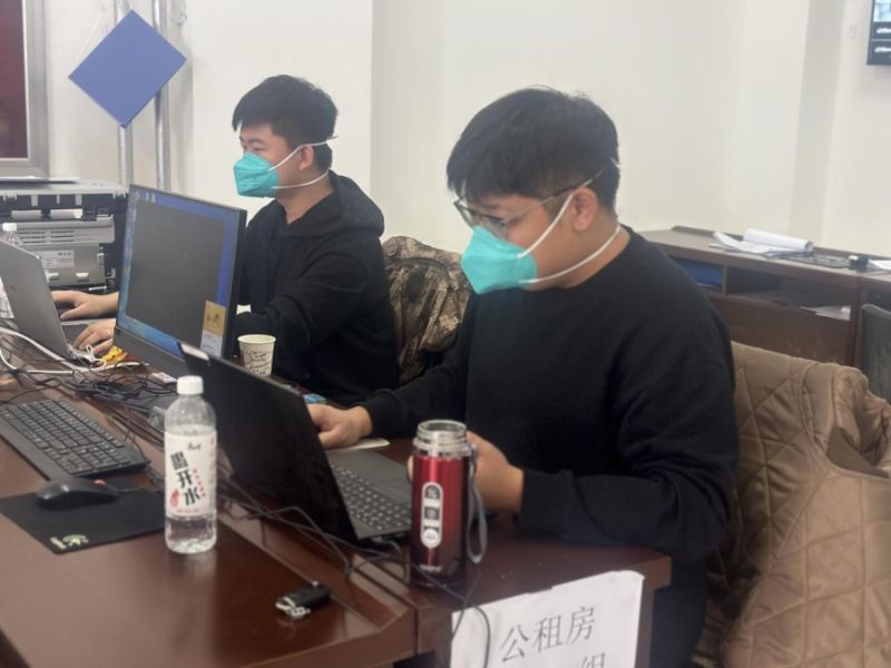 圖為張寧(右)與王然(左)在公租房隔離點(diǎn)進(jìn)行信息錄入工作