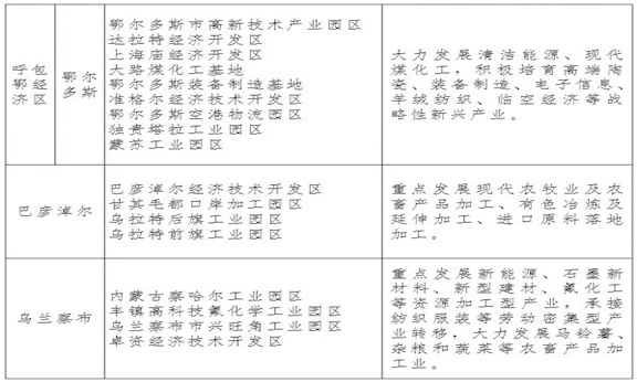 加快融入京津冀協(xié)同發(fā)展,以赤峰經(jīng)濟開發(fā)區(qū)、察哈爾工業(yè)園區(qū)、興和縣物流園區(qū)為重點打造京津冀產(chǎn)業(yè)合作共建示范園區(qū),主動承接北京制造業(yè)、商貿(mào)物流、云計算后臺服務(wù)等產(chǎn)業(yè)轉(zhuǎn)移。支持赤峰市打造京津冀協(xié)同發(fā)展產(chǎn)業(yè)合作與轉(zhuǎn)型升級示范區(qū)。創(chuàng)新與天津自貿(mào)區(qū)合作模式,共同在內(nèi)蒙古有條件的開發(fā)區(qū)設(shè)立海關(guān)特殊監(jiān)管區(qū)域和保稅監(jiān)管場所。推動蒙東地區(qū)主動融入東北經(jīng)濟區(qū)發(fā)展,采取互換資源、共建園區(qū)、飛地經(jīng)濟等多種方式,加快推進能源、裝備、科技、物流等產(chǎn)業(yè)互動發(fā)展,構(gòu)建“錫赤朝錦萬億元產(chǎn)業(yè)發(fā)展帶”。推進蒙晉冀(烏大張)長城金三角合作區(qū)建設(shè),以烏蘭察布市開發(fā)區(qū)為主要載體,加強產(chǎn)業(yè)互補互促、資源要素對接等方面開展實質(zhì)性合作。加快推進區(qū)域合作,以鄂爾多斯上海廟能源基地、鄂爾多斯納林河工業(yè)園區(qū)、阿拉善騰格里經(jīng)濟開發(fā)區(qū)為主要載體,加快與陜甘寧地區(qū)開發(fā)區(qū)共同打造國家綜合能源基地、新型化工基地和戰(zhàn)略性新興產(chǎn)業(yè)基地。加強與長三角、珠三角區(qū)域合作,落實《加快建設(shè)蒙蘇工業(yè)園區(qū)合作協(xié)議》,重點支持鄂爾多斯蒙蘇工業(yè)園區(qū)、赤峰玉龍工業(yè)園區(qū)等開發(fā)區(qū)與長三角、珠三角等地合作共建產(chǎn)業(yè)承接轉(zhuǎn)移園區(qū),全力爭創(chuàng)國家級承接產(chǎn)業(yè)轉(zhuǎn)移示范園區(qū)。