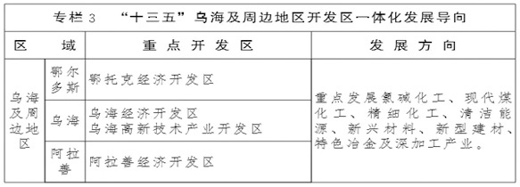 烏海及周邊開發(fā)區(qū)。加快提升烏海及周邊地區(qū)開發(fā)區(qū)聯(lián)動融合發(fā)展,推進烏斯太—烏達、千里山—蒙西、西來峰—棋盤井工業(yè)集中區(qū)建設(shè),促進產(chǎn)業(yè)延伸、循環(huán)、耦合,聯(lián)合打造全國重要的煤焦化工、氯堿化工基地、我國西部地區(qū)重要的精細(xì)化工產(chǎn)業(yè)基地和區(qū)域生產(chǎn)性服務(wù)業(yè)中心。以阿拉善經(jīng)濟開發(fā)區(qū)、烏海經(jīng)濟開發(fā)區(qū)、鄂托克經(jīng)濟開發(fā)區(qū)為重點,加快工業(yè)集中發(fā)展,打造國家級開發(fā)區(qū)和千億園區(qū)。