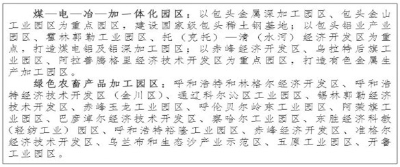 工業(yè)園區(qū)(示范區(qū))。重點布局在礦產(chǎn)、能源、農(nóng)畜產(chǎn)品等資源豐富,交通便利,水資源和生態(tài)環(huán)境承載能力強,有一定產(chǎn)業(yè)基礎(chǔ)的地區(qū)?!笆濉睍r期,積極推進產(chǎn)業(yè)從原材料初級加工向下游精深加工轉(zhuǎn)變,同時大力培育先進制造業(yè)和高新技術(shù)產(chǎn)業(yè),產(chǎn)業(yè)組織形態(tài)從傳統(tǒng)塊狀經(jīng)濟向現(xiàn)代產(chǎn)業(yè)集群轉(zhuǎn)變,配套發(fā)展現(xiàn)代服務(wù)業(yè),加快工業(yè)園區(qū)實現(xiàn)由單純生產(chǎn)制造向生產(chǎn)、生活、生態(tài)共生發(fā)展轉(zhuǎn)變,成為全區(qū)工業(yè)轉(zhuǎn)型升級的主陣地。